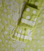 • Product Id : 4211506 • Package Details : 1 Top / 1 Bottom / 1 Dupatta • Type : Dress Materials • Region : Lucknow • Occasion : Festive • Type : Chikankari • Look : Traditional • Sleeve : Full Sleeve • Neck Style : Round Neck • Stitching : Unstitched • Fabric : Georgette • Color : Green • Work : Chikankari • Min Bustsize Fit : 38 • Max Bustsize Fit : 42 Stitching [+]