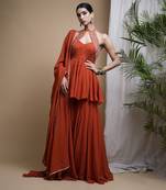 - A sophisticated rust orange indo anarkali suit with a sweetheart neck with double kali ghera (double flare).
