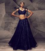 The Shimmering Blue Lehenga embellished with with sequins work throughout the lehanga paired with 3D statement shoulder brooch blouse and trail dupatta.