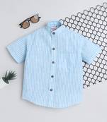 Blue Cotton Linen Half Sleeves Striped Mandarin Collar Shirt For Girls And Boys