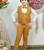 Boys Cotton Full Sleeves Solid 3 Piece Party Suit Set With Bow Mustard