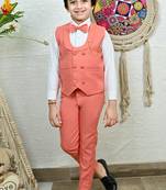 Boys Cotton Full Sleeves Solid 3 Piece Party Suit Set With Bow Peach