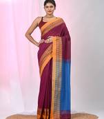 Burgundy And Sapphire Blue Handspun Cotton Saree With Vibrant Borders