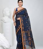 Embrace the timeless charm of Bengal weaving with this elegant Tant cotton saree. Featuring a rich navy blue base adorned with mustard texture motifs and polka dot patterns, this saree exudes sophistication and grace. The mustard border and pallu create a striking contrast, making it an ideal pick for festive occasions, cultural gatherings, or elegant evening wear. Crafted from lightweight and breathable cotton, it ensures all-day comfort without compromising on style. Pair it with statement jewelry to complete your ethnic look.
