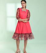 Step into elegance and grace with the stunning peach cotton ruffled A-line dress. The charming collar and flared silhouette of this dress will effortlessly accentuate your figure, while the elbow sleeves add a playful touch. Embrace the chic allure of the ruffled hemline that sways with every step you take. Crafted from solid cotton fabric, it reflects sophistication and timeless style. Sleeves and hemline are crafted with printed organza fabric. Elevate your wardrobe with this dreamy dress that promises to make you feel like a true fashion icon.