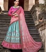 Sky Blue Resham & Zari Embroidered Satin Designer Bridal Wedding & Party Wear Festival Semi Stitched Lehenga