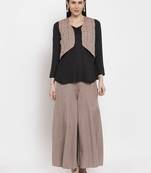 Category Of Article is Kurta Sets; Sub Category is Indo Western; Color of Top is Black; Color of Bottom is Brown; Fabric used in Top is Viscose Rayon; Fabric used in Bottom is Cotton; Sleeves Type is Regular Sleeves; Sleeves Length is Full-length Sleeves; Dress Length is None; Top Style is Regular; Bottom Style is Palazzos; Lining Used in Top No; Lining Used in Bottom No; Closure Top is Slip On; Closure Bottom is Concealed Zip; No. Of Pocket is 0; Fit is Regular Fit; USP is 3 Piece Indo Western