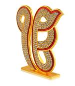 Add a touch of divine elegance to your home with this exquisite Ek Omkar spiritual stand. This stunning piece features the sacred Sikh symbol meticulously crafted in brass with lustrous gold plating. The graceful curves of the Ek Omkar symbol are adorned with brilliant CZ (cubic zirconia) stones that catch and reflect light beautifully, creating a mesmerising sparkle. The red enamel detailing along the edges adds a striking contrast to the golden finish, enhancing its visual appeal. Standing proudly on a stable golden base, this decorative piece serves as both a spiritual symbol and an artistic masterpiece. Perfect for your prayer room, living area, or as a thoughtful gift for special occasions, this ornate stand measures approximately 20 cm in height. The premium finish and intricate detailing make it a timeless addition to your home décor collection. Each piece showcases fine craftsmanship and attention to detail in its construction.