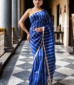 handloom mul cotton saree-royal blue body with gold & silver zari stripes, indulge in graceful sophistication: this royal blue mul‑cotton saree is woven with shimmering gold and silver zari stripes that run vertically, adding texture, depth, and tradition with every fold. the lightweight mulmul cotton ensures breathability and comfort, while the traditional zari weave infuses subtle opulence—making it a standout for both formal and festive occasions.