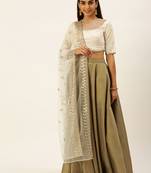 Presenting beige and prairie sand lehenga set, features beige embroidered net blouse with close neck in the front and with deep keyhole at the back, has elbow sleeves with blouse till natural waist length with back hook opening and had gold trims in the sleeve and blouse hem. It is paired with prairie sand taffeta bottom of full circular flare till floor length with band with elastic waist band and white with gold embroidered dupatta.