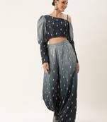 Presenting grey chinon embroidered co-ords set, features a grey chinon embroidered blouse front and back normal one shoulder neck, gathers till elbow with full sleeve cuff and functional loop buttons, natural waist blouse, side zip opening. It's paired up with grey chinon embroidered wide leg pant till ankle length, inseam pocket both the side, waist band type band with elastic..