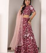Ethnovog Ready To Wear Maroon Kota Silk Digital Printed Boat Neck Lehenga Set