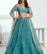 Rama Green Net Fabric Lahenga With Sequins And Thread Embroidery Work