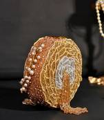 The Ella Golden Suede Embellished Clutch is an elegant, handcrafted bag that features a beautiful round shape with intricate cutdana and thread work in gold and silver tones. The central design showcases a delicate embroidered flower with cascading fringe details of crystals and beads, adding a touch of glamour. The metal chain, adorned with pearl accents, enhances the luxurious feel of the bag. Perfect for special occasions or adding a unique flair to any outfit, this bag combines timeless style with a modern twist. A statement piece that will complement both evening and cocktail wear beautifully. The inner and outer lining is made of suede. Product colour may slightly vary due to photographic lighting sources or your monitor settings.