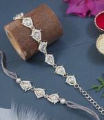 • Product Id : 4409495 • Package Details : 1 Rakhi/1 Lumba/Roli Chawa/Card. • Type : Others • Look : Traditional • Jewellery Work : Kundan • Color : Grey • Plating : Yellow Gold • Base Material : Alloy • Piercing : No • Pearl Type : Na • Pearl Shape : Na • Care : Keep The Jewelry Away From Direct Heat, Water, Perfumes, Deodorants And Other Strong Chemicals As They May React With The Metal Or Plating. Store The Jewelry When Not In Use In A Storage Box Or A Cloth Pouch To Retain Its Shine. Payments [+]