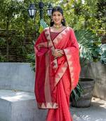 Women's Coral Tussar Silk Blend Temple Border With Zari Lining Traditional Saree With Blouse