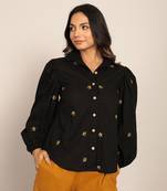 *The shirt, in a timeless black hue, is the epitome of versatility. *With a classic collar neckline, full sleeves, and a relaxed fit, it embodies a balance of contemporary design and enduring comfort. *The front closure, adorned with six buttons, adds a touch of understated sophistication, making it perfect for any occasion. *This ensemble, featuring a black shirt paired with any pant, is a testament to refined style that effortlessly transitions from casual to chic. *Elevate your wardrobe with this essential pairing that effortlessly takes you from day to night, offering a relaxed yet refined look for the discerning individual.