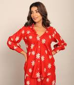 *The red and white floral print graces the fabric with delicate intricacy, reminiscent of a garden in full bloom. *The collared shirt, with its relaxed fit and full sleeves, offers a graceful silhouette that seamlessly merges comfort with sophistication. *The closure of six buttons on the shirt adds a classic touch, allowing for easy wear and removal. The radiant floral patterns bring a playful yet refined aesthetic to this shirt, making it a versatile choice for a range of occasions. *Embrace the beauty of nature with this versatile and sophisticated ensemble that seamlessly marries white, red, and the timeless allure of floral patterns.