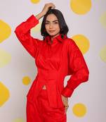 Red Summer Waist Fitted With Back Tie Up Collared 100% Cotton Shirt