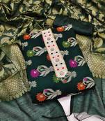 • Product Id : 3978876 • Package Details : 1 Top / 1 Bottom / 1 Dupatta • Type : Dress Materials • Region : Other • Type : Zari Woven • Look : Fashion • Sleeve : Quarter Sleeve • Stitching : Unstitched • Color : Green • Fabric : Banarasi • Work : Banarasi Stitching [+]