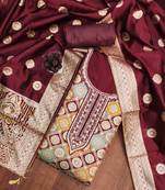 • Product Id : 4604721 • Package Details : 1 Top / 1 Bottom / 1 Dupatta • Type : Dress Materials • Region : Other • Type : Zari Woven • Look : Traditional • Sleeve : Quarter Sleeve • Stitching : Unstitched • Fabric : Jacquard • Color : Maroon • Work : Geometric Print Stitching [+]