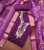 • Product Id : 4549635 • Package Details : 1 Top / 1 Bottom / 1 Dupatta • Type : Dress Materials • Region : Other • Work : Woven • Type : Sequins Work • Look : Traditional • Sleeve : Quarter Sleeve • Stitching : Unstitched • Color : Purple • Fabric : Banarasi Stitching [+]