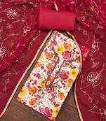 • Product Id : 4601575 • Package Details : 1 Top / 1 Bottom / 1 Dupatta • Type : Dress Materials • Region : Other • Type : Beads • Look : Traditional • Sleeve : Quarter Sleeve • Stitching : Unstitched • Fabric : Cotton • Color : Red • Work : Floral Print Stitching [+]