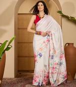 White Satin Georgette Printed Saree With Unstitched Blouse