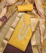 • Product Id : 4549634 • Package Details : 1 Top / 1 Bottom / 1 Dupatta • Type : Dress Materials • Region : Other • Work : Woven • Type : Sequins Work • Look : Traditional • Sleeve : Quarter Sleeve • Stitching : Unstitched • Color : Yellow • Fabric : Banarasi Stitching [+]
