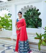 Red Soft Tussar Silk Saree With Silver And Copper Weaves Border And Ikkat Pallu With Blouse