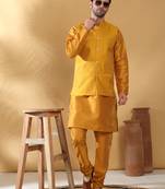 • Product Id : 4616171 • Package Details : 1 Kurta / 1 Churidar / 1 Nehru Jacket • Type : Nehru Jacket • Work : Woven • Look : Traditional • Bottom Style : Churidar • Sleeve : Full Sleeve • Color : Yellow • Top Color : Yellow • Top Fabric : Silk Blend • Bottom Fabric : Silk Blend • Fabric : Silk Blend • Stitching : Stitched Payments [+]
