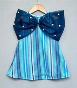 Add a splash of cool tones to your little girl's look with this Striped Knitted Blue Dress featuring a Statement Bow. The sleeveless dress showcases vertical stripes in refreshing shades of blue and white, in a super comfortable fabric offering a breezy, summery vibe. The highlight is the oversized navy blue organza bow , adorned with dainty white hand embroidered accents for a charming twist. Ideal for birthday parties, casual outings, and summer celebrations!