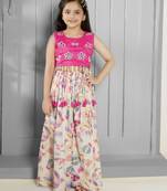 Dress your little one in festive flair with this vibrant 2-piece ethnic set, thoughtfully crafted in soft and breathable muslin cotton. The outfit includes a solid pink sleeveless top, beautifully adorned with sequin floral embroidery, and finished with a cascade of colorful tassels along the waistline for a playful touch with extra sleeve fabric inside. Paired with a pleated palazzo in a cheerful botanical print, this set is full of movement and charm. A delicate net dupatta completes the look, making it a perfect pick for Rakhi, weddings, or cultural celebrations.