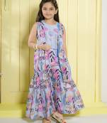 Elevate your little one's festive look with this charming Sky Blue Sharara Set with Attached Shrug, designed specially for Rakhi and joyful celebrations. Crafted in soft, breathable muslin cotton, this 2-piece set features a stylish printed sharara and matching printed shrug that drapes gracefully over the outfit. The shrug is seamlessly attached, adding flair and ease of wear.The look is completed with a solid sleeveless top, delicately adorned with fine embroidery with extra sleeve fabric inside, lending an elegant festive touch. Comfortable yet dressy, this ensemble is perfect for twirling through special moments and making memories.