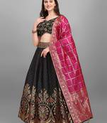 Style and trend would be at the peak of your magnificence the moment you attire this Black color Jacquard lehenga choli. Beautified with embroidered, sequins and zari work all synchronized very well through the design and design of the dress. Comes with matching jacquard choli and jacquard dupatta. The stitched lehenga unsttiched choli bust size can be customized from 34 to 42 inches.