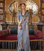 Grey And Blue Tussar Silk Digital Print Zari Border Contemporary Saree