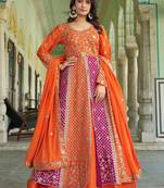 Orange And Pink Embroidery Anarkali Gown will bring out the best in you on this festive season with its exclusive karigiri. This suit set features beautiful resham thread, golden zari, sequence and beads work embroidery on chinnon gown top paired with classic satin skirt bottom and lining. The beauty part of this suit is border and butti enhanced chinnon dupatta. (Slight variation in color, fabric & work is possible. Model images are only representative.)