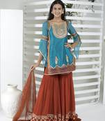 Turquoise Blue Self Embroidered Short Kurta, 3/4 Slited Semi Bell Georgette Sleeves, Hand Embroidery Of Sequence, Beads And Swarovski On Neckline, Hemline And Sleeves. Rust Banaras Brocade Detailing On Sides And Hemline Of Kurta With Triangular Gota And Lace Detailing On Hemline. Worn With Rust Georgette 2 Pauncha Pleated Sharara With Geometrical Gota Work Detailing On Sharara Edge And Rust Net Dupatta With Gold Diamantes On It