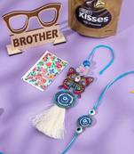 Celebrate Raksha Bandhan with love, protection, and style with the NVR Blue Evil Eye Artificial Beads Set of 2 Bhaiya Bhabhi Rakhi. Featuring the powerful Evil Eye symbol, these Rakhis are designed to protect your loved ones from negative energies while adding a touch of modern elegance to the occasion. The blue artificial beads enhance the festive appeal, giving each Rakhi a vibrant and eye-catching look. The set includes one Rakhi for Bhaiya and one for Bhabhi, making it the perfect way to honor the bond between siblings and their spouses. Paired with Roli, Chawal, Chandan, Mishri with Assorted MDF wooden stand & 33.6 gm Hershey's Kisses Chocolate, this set ensures a traditional Raksha Bandhan celebration filled with love, blessings, and protection. Thoughtfully designed and full of meaning, this set is the perfect gift to express your heartfelt wishes for your brother and sister-in-law.