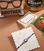 Celebrate the special bond of Raksha Bandhan with the NVR Men Blue Artificial Stones Handmade Thread Rakhi. Adorned with elegant artificial stones, this Rakhi is designed with intricate handmade craftsmanship to add a unique touch. Ideal for your Bhaiya, it symbolizes love, care, and protection. The adjustable thread ensures a comfortable fit for all wrist sizes. Complete with Roli, Chawal, Chandan, Mishri with Assorted MDF wooden stand & 33.6 gm Hershey's Kisses Chocolate, this set allows you to perform the traditional Raksha Bandhan rituals. A beautiful and meaningful gift to convey your blessings and affection.