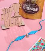 Celebrate the special bond of Raksha Bandhan with the NVR Men Blue Pearls Unique Design Thread Rakhi. Featuring elegant blue pearls in a unique design, this Rakhi adds a touch of sophistication and charm to your celebration. Perfect for your Bhaiya, it symbolizes love, care, and protection. The adjustable thread ensures a comfortable fit for all wrist sizes. The set comes complete with Roli, Chawal, Chandan, Mishri with Assorted MDF wooden stand & 33.6 gm Hershey's Kisses Chocolate for the traditional Raksha Bandhan rituals. A beautiful and meaningful gift to convey your affection and blessings this Raksha Bandhan.
