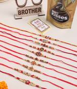 Celebrate the bond of love and protection with the NVR Men Set of 10 Red Artificial Stones and Beads Rudraksh Thread Rakhis. Featuring artificial stones, beads, and Rudraksh, this Rakhi set combines tradition with elegance. The Rudraksh symbolizes spiritual protection and positivity, making it perfect for your Bhaiya. The adjustable thread ensures a comfortable fit for all wrist sizes. This set includes Roli, Chawal, Chandan, Mishri with Assorted MDF wooden stand & 33.6 gm Hershey's Kisses Chocolate for completing the traditional Raksha Bandhan rituals. A meaningful and thoughtful gift to express your blessings and affection.