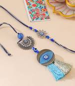 Set Of 2 Blue Evil Eye Artificial Beads Bhaiya Bhabhi Rakhi With Roli Chawal Chandan & Mishri