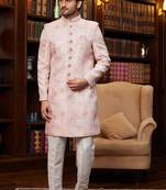 Pink Jaquard Silk Sherwani With Faux Satin Pajama For Mens