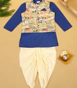 • Product Id : 4492427 • Package Details : Pack Of 1 Kurta || 1 Pajama || 1 Jacket • Type : Kids Kurta Pyjama • Work : Printed • Sleeve : Full Sleeve • Neck Style : Band Collar Neck Kameez • Bottom Fabric : Cotton • Bottom Color : Cream • Top Color : Blue • Top Fabric : Cotton • Bottom Style : Dhoti • Stitching : Stitched • Gender : Boy Payments [+]