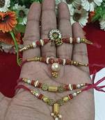 Celebrate The Special Bond Of Raksha Bandhan With Shreya Fashion Set Of 2 Gold Toned Stone Studded & Beaded Bhaiya Bhabi Rakhi. This Exquisite Set Includes Two Beautifully Crafted Rakhis, One For Your Brother And One For Your Sister In Law, Symbolizing Your Love And Appreciation For Both. Each Rakhi Is Meticulously Designed With Sparkling Stones And Intricate Beads, Offering A Perfect Blend Of Tradition And Modern Elegance. The Rich Gold Tone Adds A Touch Of Luxury, Making These Rakhis Stand Out.The Set Is Thoughtfully Packaged With Traditional Roli Chawal, Chandan, And Mishri, Ensuring You Have Everything Needed For The Sacred Ritual. This Comprehensive Kit Not Only Enhances The Festive Spirit But Also Honors The Customs And Rituals That Make Raksha Bandhan So Special. Perfect For The Occasion, These Rakhis Are More Than Just Accessories; They Are A Heartfelt Expression Of Your Bond And Commitment. Make This Raksha Bandhan Unforgettable By Celebrating It With This Elegant And Meaningful Set.