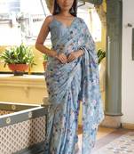 Light Dusty Blue Floral Print Chiffon Saree With Unstiched Blouse Piece