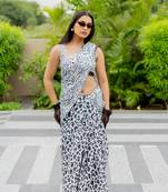 White Poly Cotton Animal Print Satin Stripes Zari Border Saree