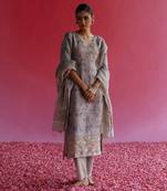 A pure linen silk handloom sequin weave fabric quarter sleeve printed a-line kurta having zari scallops on the neckline and sleeves delicately hand embroidered with golden & silver zardozi work. The kurta also has a pure zari jamdani handloom border on the daaman. The kurta is complemented with a soft & pure kala cotton handloom straight pants with a side closure. To complete the look, there is given a pure handloom sequin weave fabric printed dupatta with a pure zari jamdani border and handmade tassels.