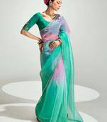 This gorgeous shaded saree in hues of teal and lavender is crafted from luxurious organza fabric, offering a soft, ethereal drape. Its fluidity and shine make it perfect for festive and formal occasions.